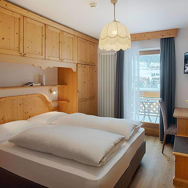 Unsere Standardzimmer sind nach Norden ausgerichtet und haben eine wunderschöne Aussicht auf den Sassongher. Sie sind mit hellen Holzmöbeln ausgestattet und haben einen Parkettboden.