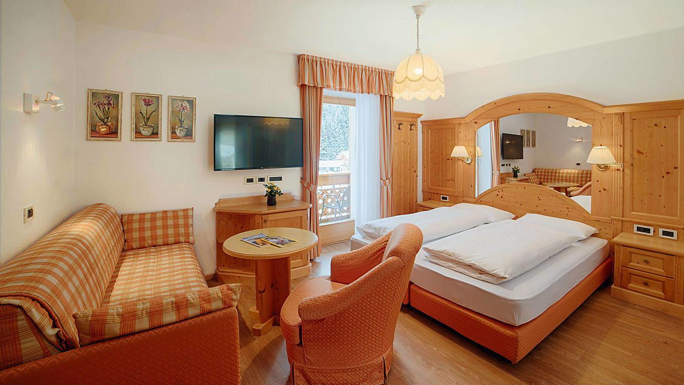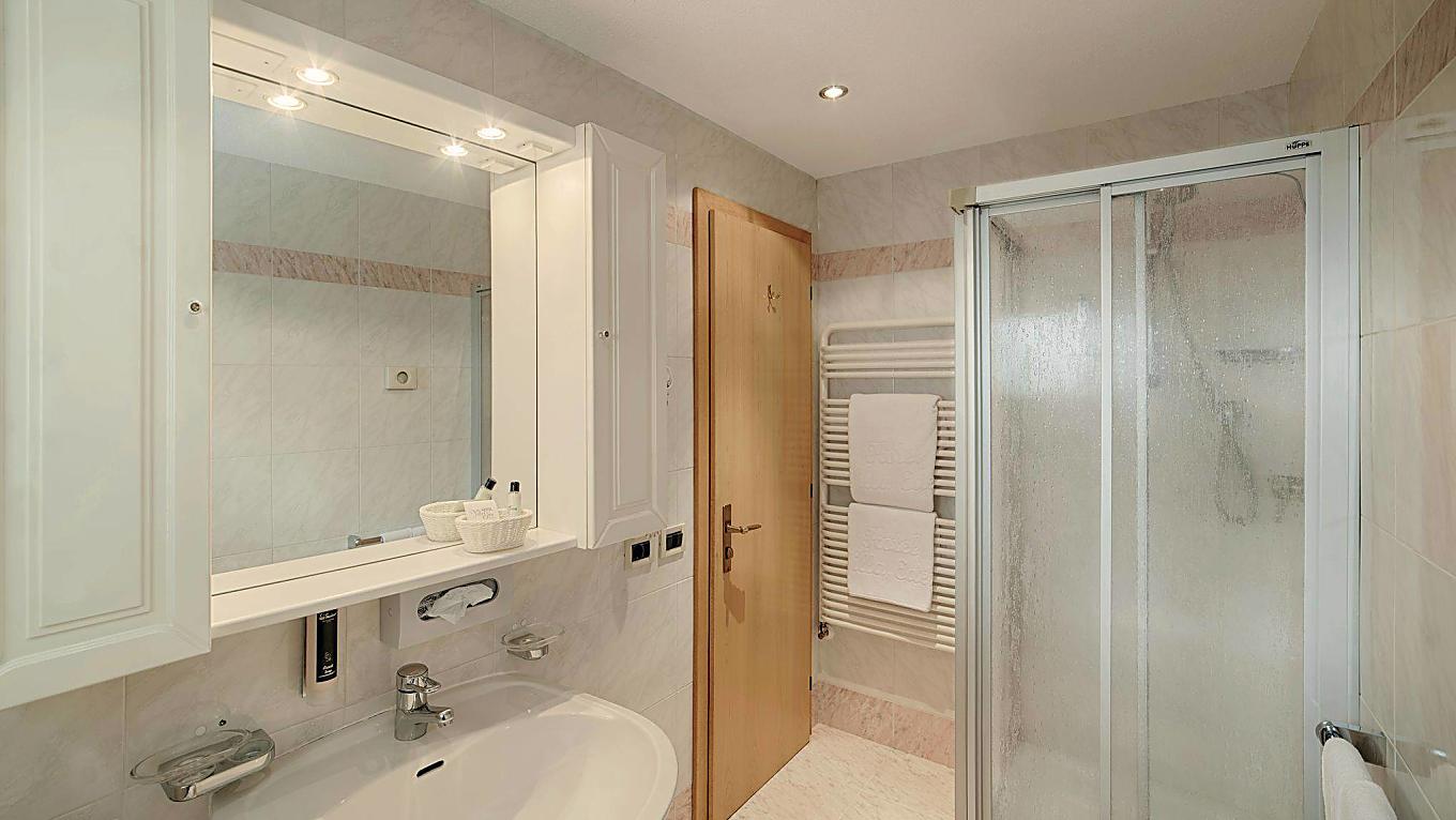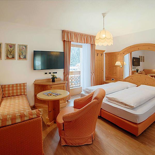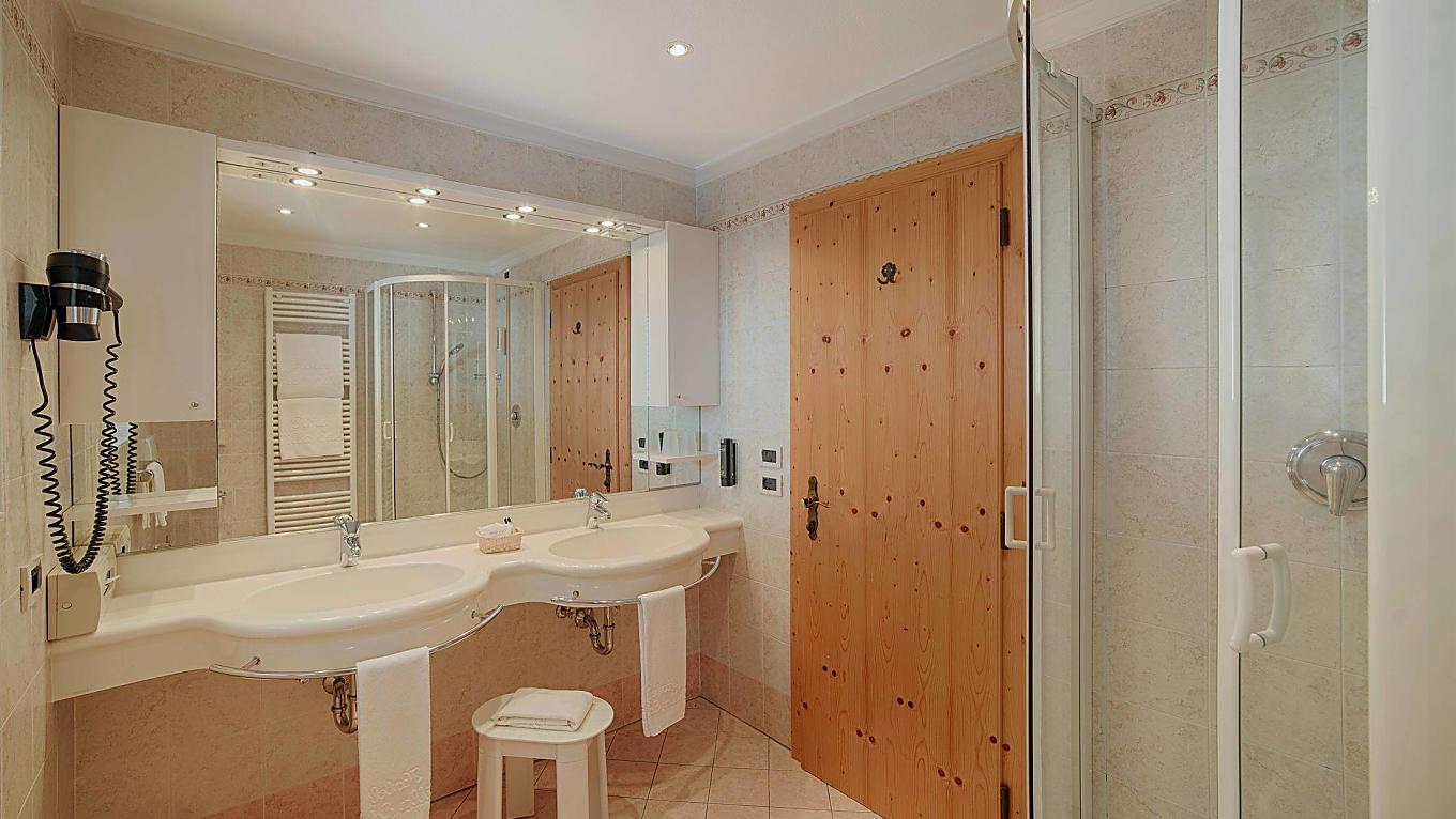 Our Comfort rooms are west facing, with a view of the Sella Mountain Group and Gardena Pass, or north facing with a view of Sassongher, the main mountain of Corvara. The rustically styled furnishing is realized in bright wood, the bathrooms are equipped with a shower. All rooms have parquet floors.