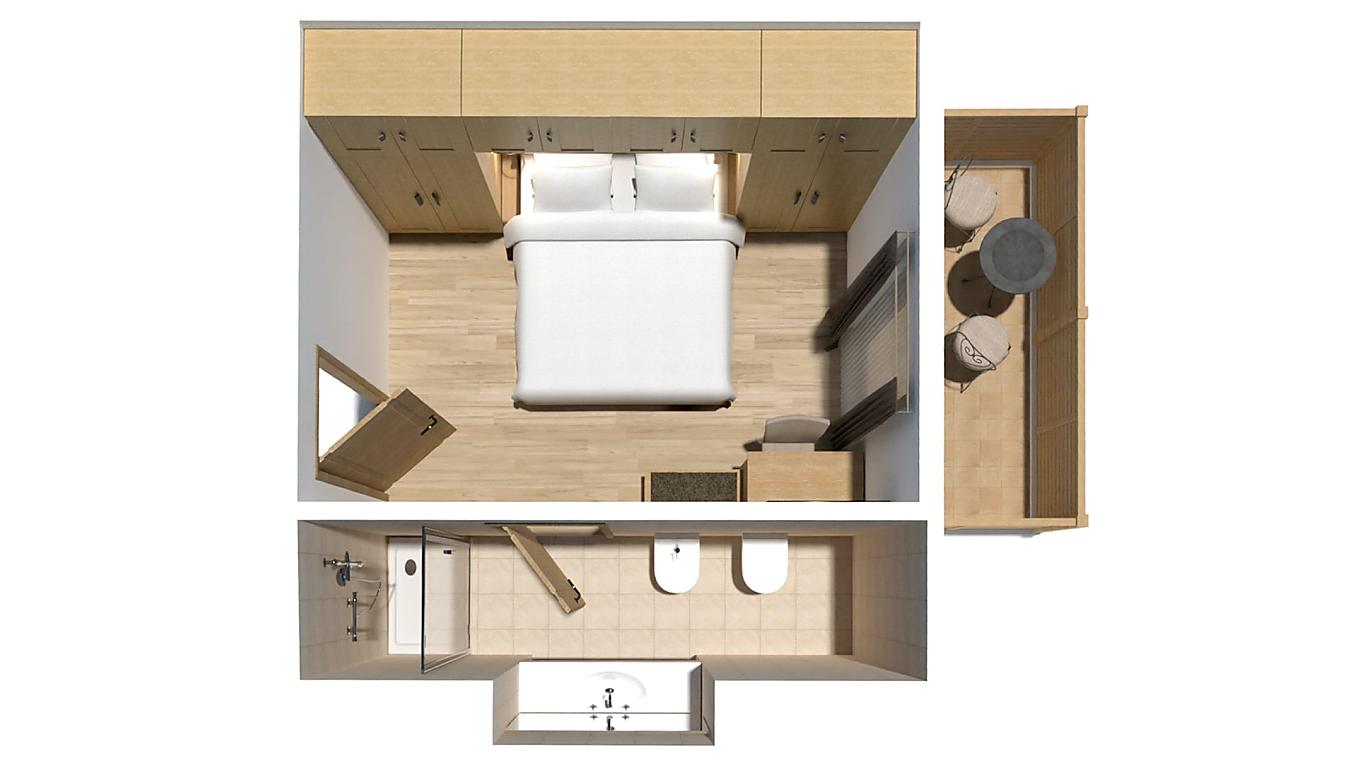 L'arredamento è in legno chiaro, i pavimenti sono in parquet.